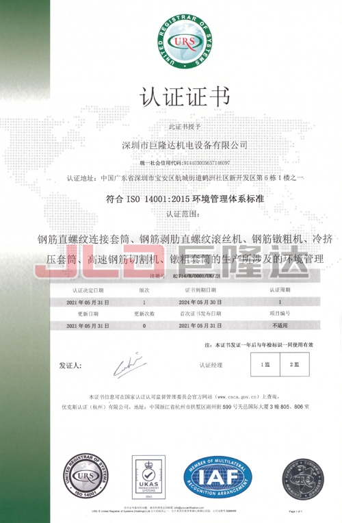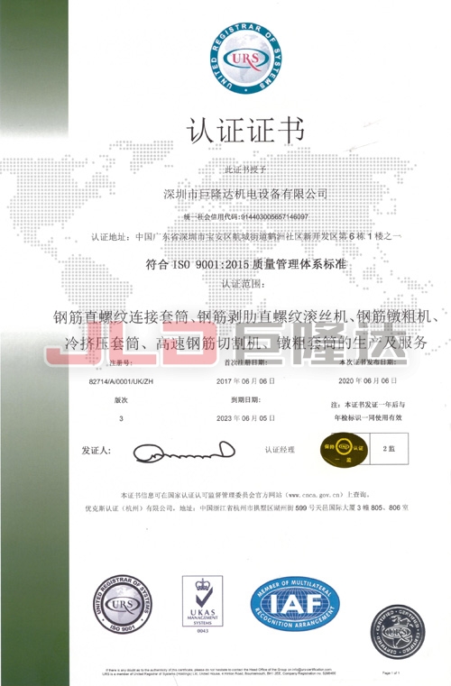 深圳市巨隆達(dá)機(jī)電設(shè)備有限公司成立于 2010 年,是一家專業(yè)生產(chǎn)鋼筋加工成套設(shè)備、連接套筒系列產(chǎn)品的制造商,是一家集研發(fā)、生產(chǎn)、銷(xiāo)售、出口、服務(wù)為一體的綜合型企業(yè)。本公司獲得國(guó)家發(fā)明專利和使用新型專利20余項(xiàng),擁有專業(yè)的研發(fā)團(tuán)隊(duì)、先進(jìn)的生產(chǎn)設(shè)備,完善的產(chǎn)品檢測(cè)手段和質(zhì)量保證體系。通過(guò)了建研院檢測(cè)中心有限公司檢測(cè)、符合英國(guó) UKAS:ISO 9001:2015質(zhì)量管理體系標(biāo)準(zhǔn)認(rèn)證企業(yè)、ISO 14001:2015 環(huán)境管理體系標(biāo)準(zhǔn)、ISO45001:2018 健康安全管理體系標(biāo)準(zhǔn)。達(dá)到深圳市寶安區(qū)環(huán)境保護(hù)和水務(wù)局建設(shè)項(xiàng)目環(huán)境影響審查批復(fù)企業(yè)、榮獲深圳平安金融中心工程 2015年度優(yōu)秀材料、設(shè)備供應(yīng)商稱號(hào)企業(yè),多年連續(xù)榮獲廣東省守合同重信用企業(yè)稱號(hào)。
